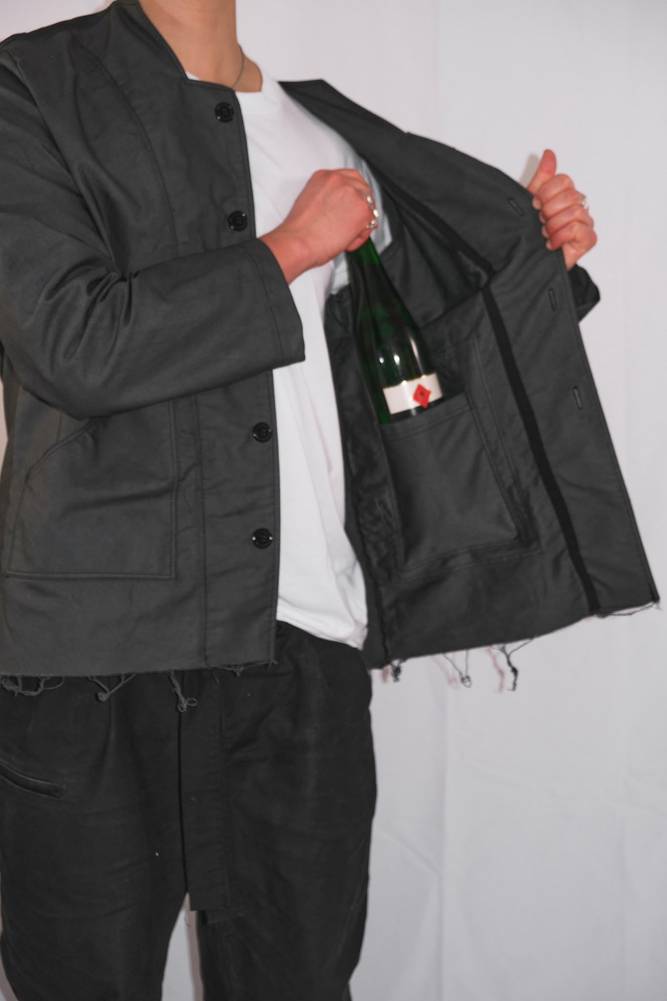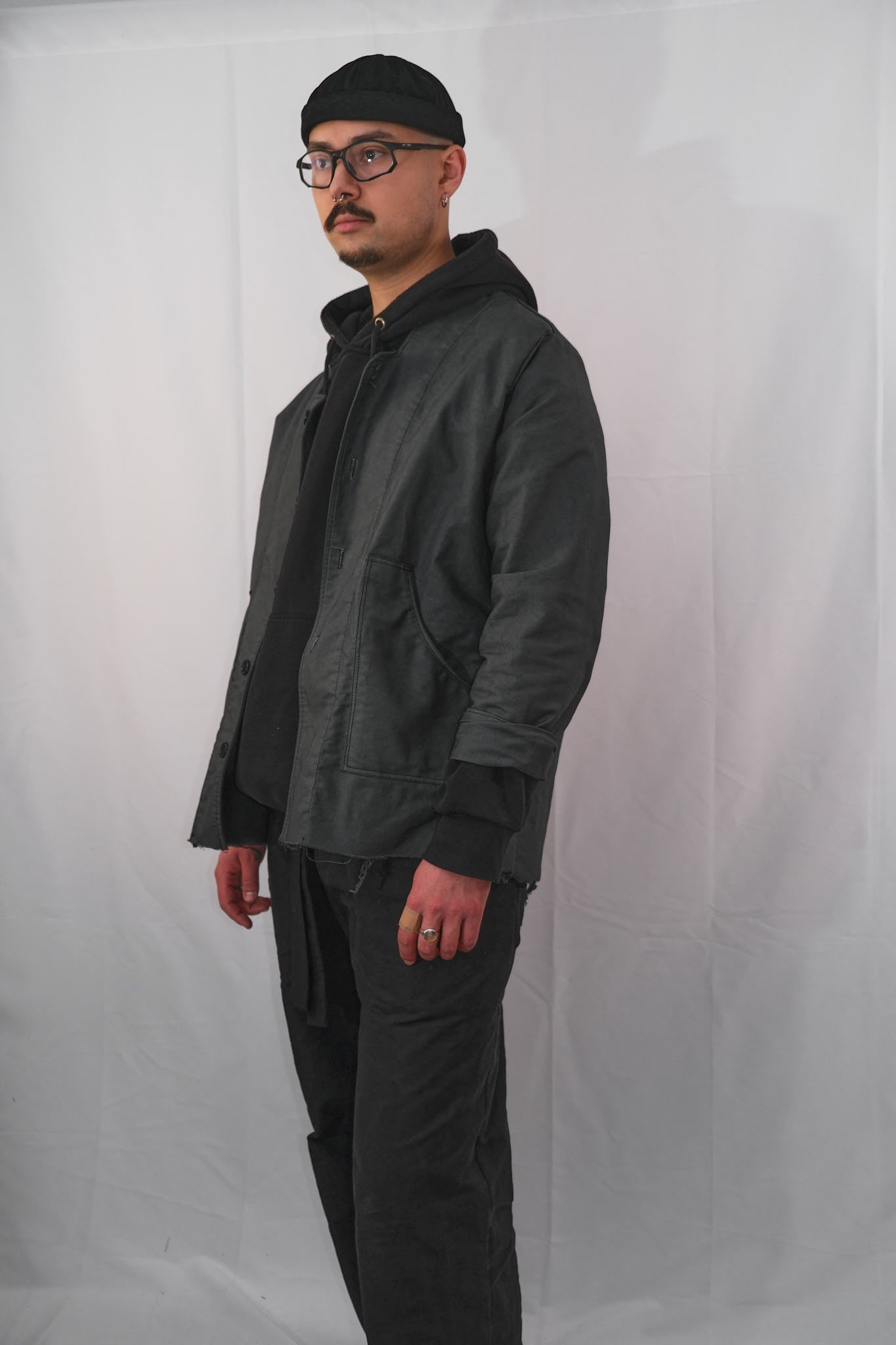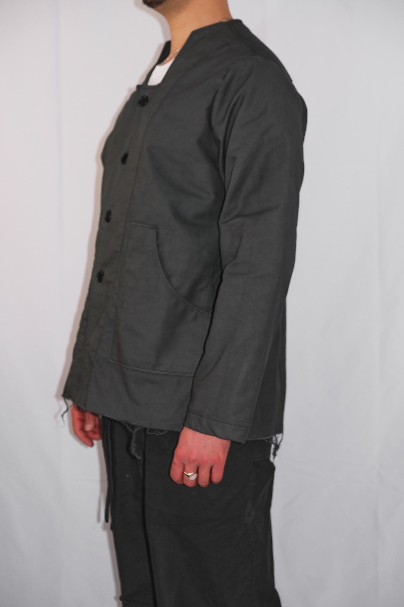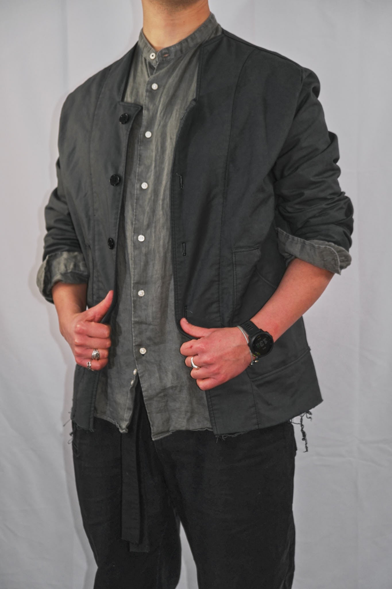 Arthur's Coat combines an utilitarian canvas construction with a refined, collarless silhouette. Designed with meticulous attention for detail and solution centered thinking. Cut, Sewn and Dyed by hand by one craftsman in my studio in Friedrichshain, Berlin.
