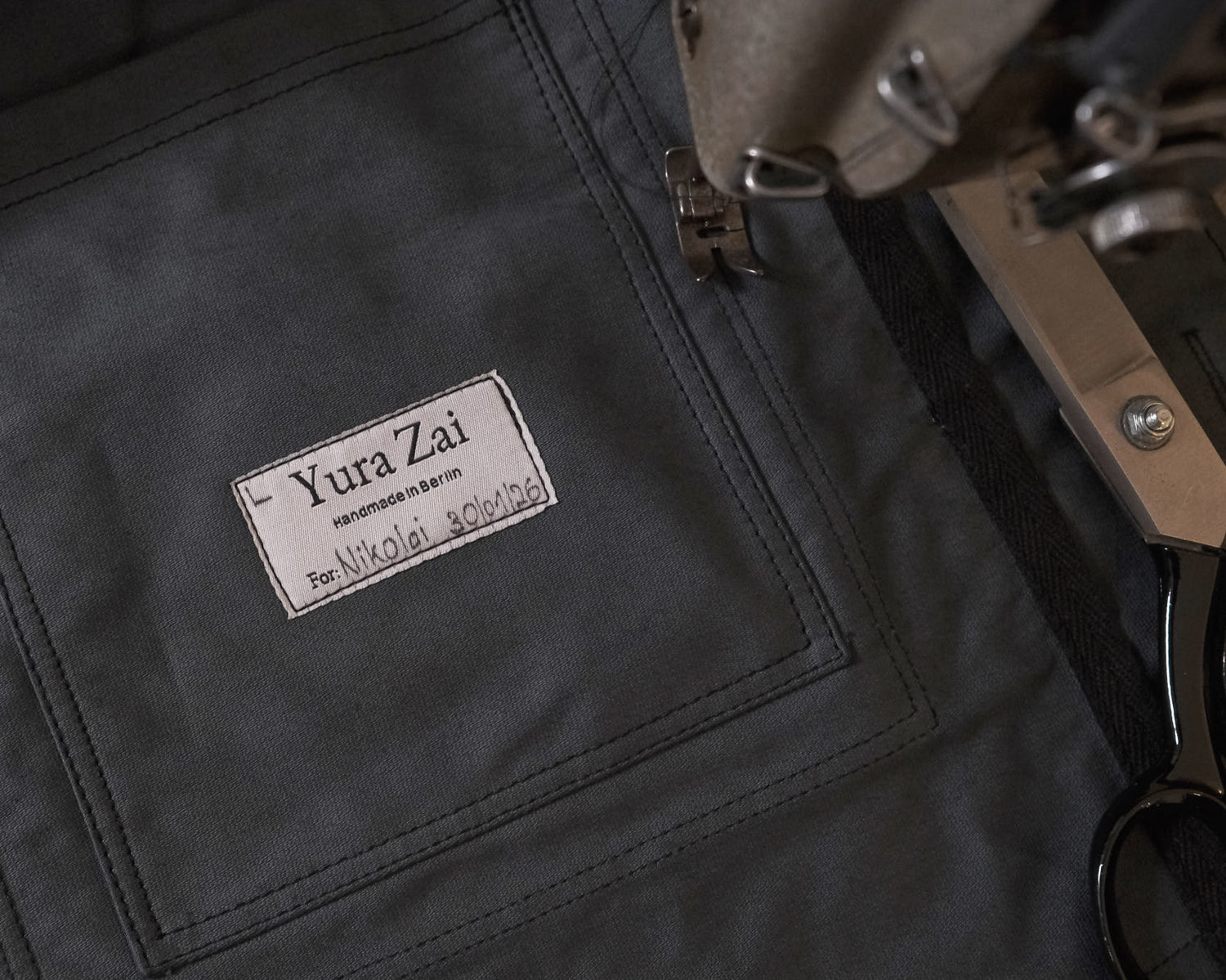 I do everything myself. Everything is done in my own studio, from designs and drafts, pattern developing and prototyping to the actual manufacturing of every single piece of clothing. Every piece is cut, sewn and dyed by one maker (me) only based on your unique specifications and gets a brand tag with your name, your size and the date of production.